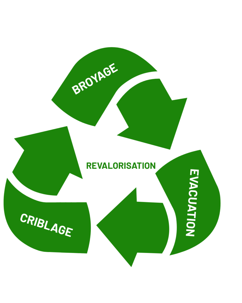 Nos opérations de criblage s’inscrivent dans un processus de valorisation destinée à des partenaires locaux : entreprises Bois énergie collaborant avec les chaufferies, agriculteurs pour compostage en bout de champ ou paysagistes partenaires utilisant le produit en paillage, amendements organiques…